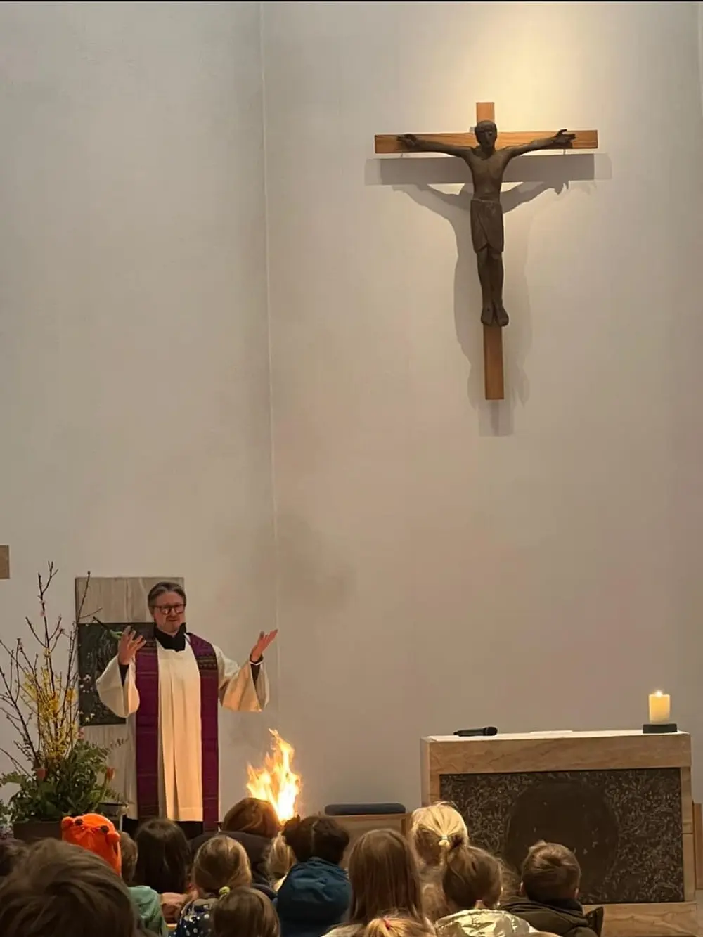 Die Kinder brachten die Palmenzweige des letzten Jahres aus ihren Klassen mit und Pfarrer Vorotnjak verbrannte sie unter den staunenden Blicken der Kinder zu Asche. Die Kinder der Klasse 3a erzählten, was sie sich für die Fastenzeit vorgenommen haben und gaben so den anderen viele verschiedene Beispiele, wie "nicht mit meiner Schwester streiten", "die Geschirrspülmaschine ausräumen" und "auf das Fernsehen verzichten" oder "keine Süßigkeiten essen". Pfarrer Vorotnjak erklärte, dass die Fastenzeit die Vorbereitung auf Ostern sei. Anschließend bekamen alle ein Aschekreuz auf die Stirn und zum Auszug sangen wir "Herr, gib' uns deinen Frieden".